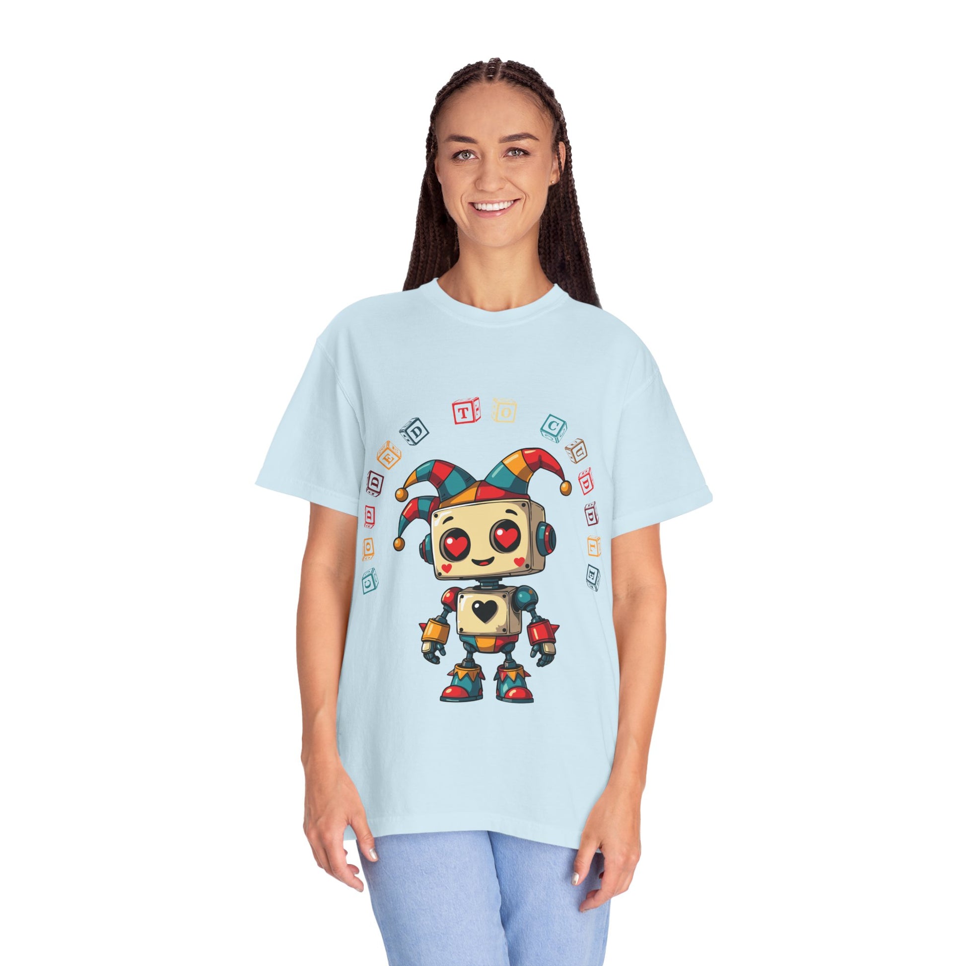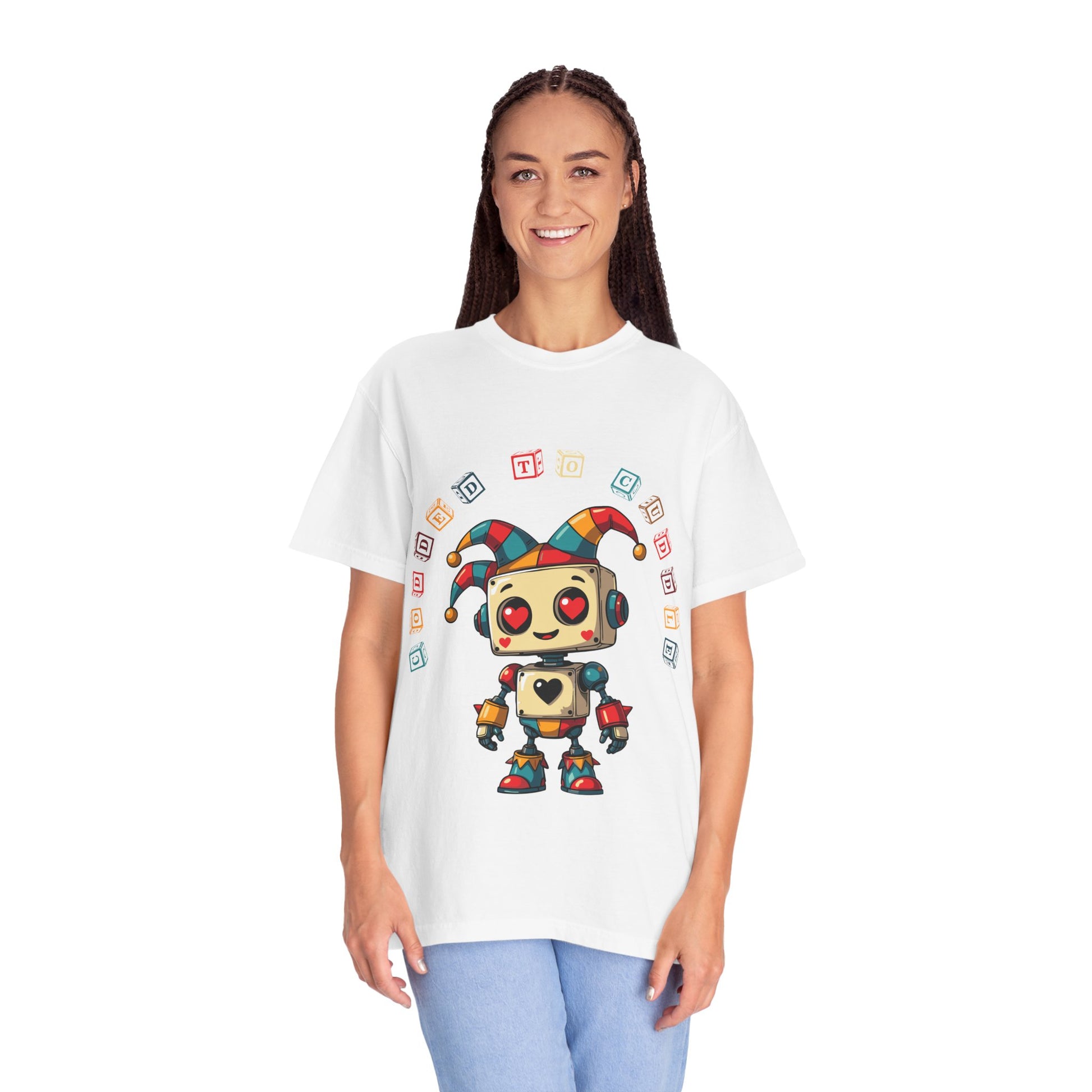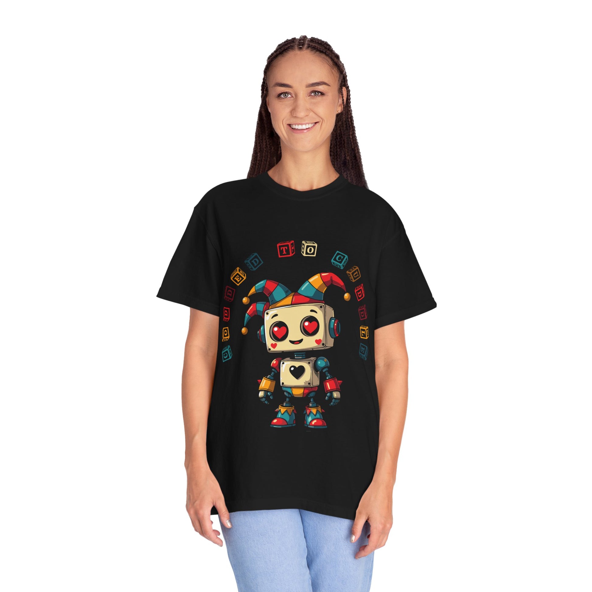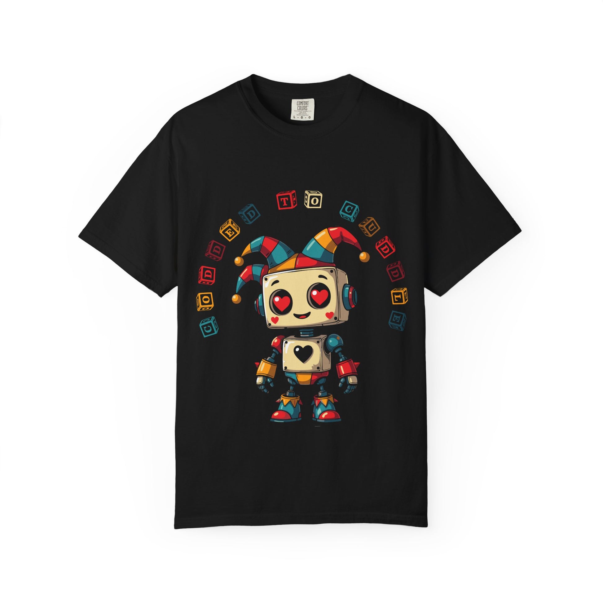 Looking for a fun and unique addition to your wardrobe? This premium quality T-shirt features an adorable jester robot with hearts for eyes, spreading love and laughter wherever it goes. The design is printed with high-quality, long-lasting ink on a soft, comfortable fabric, ensuring both a great look and feel. It's the perfect shirt for anyone who loves robots, jesters, or just wants to wear something that makes people smile. Grab one for yourself or as a gift for a friend!